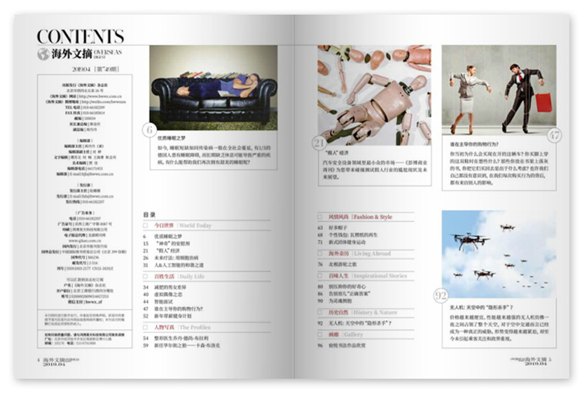《海外文摘》主要欄目:海外親歷、外交官侃世界、中國人在海外、外國人在中國、今日世界等。