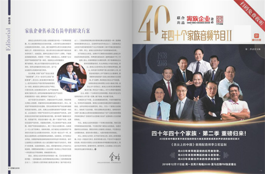 《家族企業(yè)》(月刊)創(chuàng)刊于2015年,多年來雜志內(nèi)容及形式方面與時(shí)俱進(jìn),并以其形式和內(nèi)容的豐富性及多樣性,贏得了不同階層讀者的喜愛與擁護(hù)。有“治業(yè)、修身、齊家、益天下”四大版塊,秉承只有中國的傳承才能傳承中國。