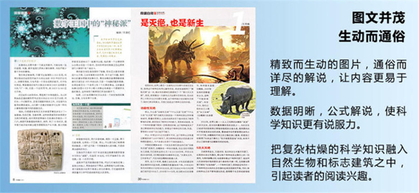雜志緊緊把握時(shí)代脈搏,所選取知識(shí)都是與生活息息相關(guān),很有時(shí)代感的知識(shí),講解非常詳細(xì),可讀性強(qiáng),深入淺出,是一本開闊視野、開拓思維的雜志。一本塑造正確,健康的價(jià)值觀的雜志,多年以來(lái)始終以弘揚(yáng)人類優(yōu)秀文化為己任,堅(jiān)持把社會(huì)效益放在首位,努力貼近讀者生活,深受廣大讀者的青睞。