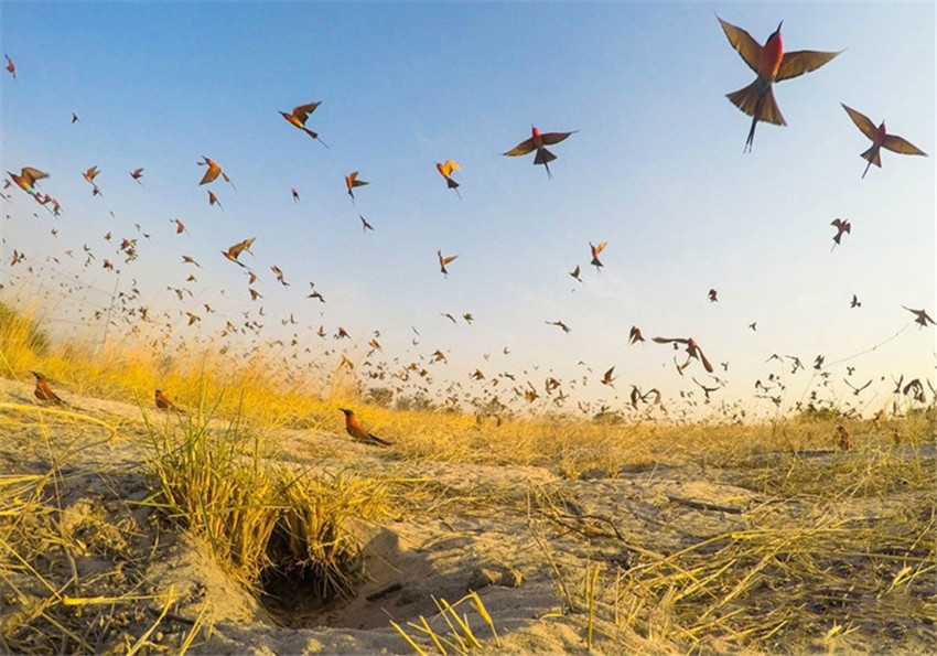 在納米比亞的贊比西河,無(wú)以計(jì)數(shù)的深紅色的食蜂鳥(niǎo)(南紅蜂虎)沖上藍(lán)天。你來(lái)掌鏡攝影師JasonBoswell說(shuō):“”當(dāng)時(shí)一組人正想為幾百只食蜂鳥(niǎo)做標(biāo)記,以了解它們離開(kāi)這片土壤后去了哪里。為了躲避人群,鳥(niǎo)兒紛紛起飛,所以才有了這一幕。”今天是美國(guó)國(guó)家愛(ài)鳥(niǎo)節(jié),這個(gè)節(jié)日正好碰上一個(gè)由市民為了觀(guān)察統(tǒng)計(jì)國(guó)內(nèi)鳥(niǎo)類(lèi)健康狀況而發(fā)起的項(xiàng)目——圣誕節(jié)鳥(niǎo)類(lèi)數(shù)量統(tǒng)計(jì)。