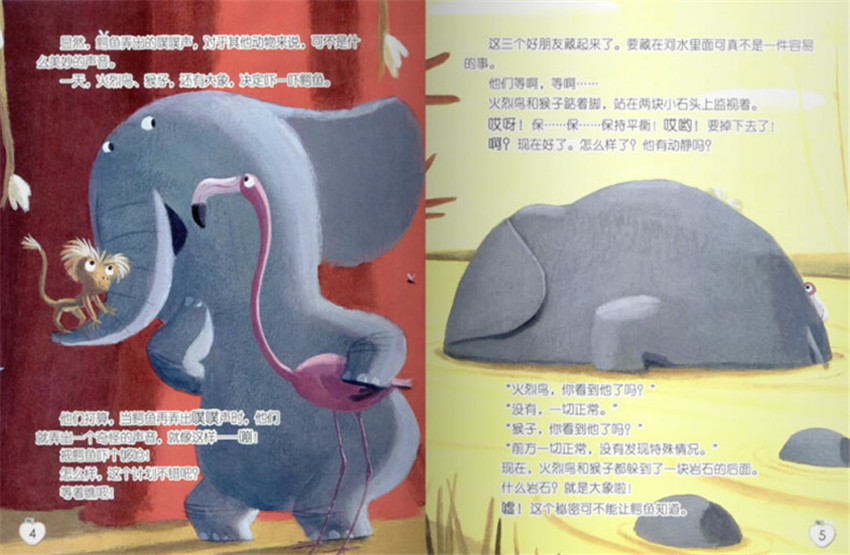 咔!鱷魚一口咬在巖石的屁股上。呃,應(yīng)該是大象的屁股上。哎呀!哎喲!大象疼得跌倒在水里啦!火烈鳥和猴子也跟著遭殃啦!哎呀!哎喲!火烈鳥為了不掉進(jìn)水里,慌忙抬頭,一口咬住了猴子的尾巴!“咕嚕嚕’,猴子被拖進(jìn)水里,可是他不會(huì)游泳...啊!噗!鱷魚也沉到了水里....