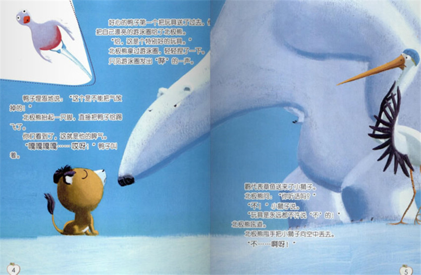 好心的鴨子及時(shí)一個(gè)把玩具送了過(guò)去,把自己漂亮的游泳圈給了北極熊,“給,這是個(gè)特別好的玩具,北極熊拿過(guò)游泳圈,輕輕捏了一下。只見游泳圈發(fā)出“嗶”的聲。鴨子埋怨地說(shuō):“這個(gè)是不能把氣放掉的,北極熊抬起一只腳,直接把鴨子給踢飛了,你們看到了。這就是他的脾氣?!案赂赂赂?.哎呀1”鴨子叫著。