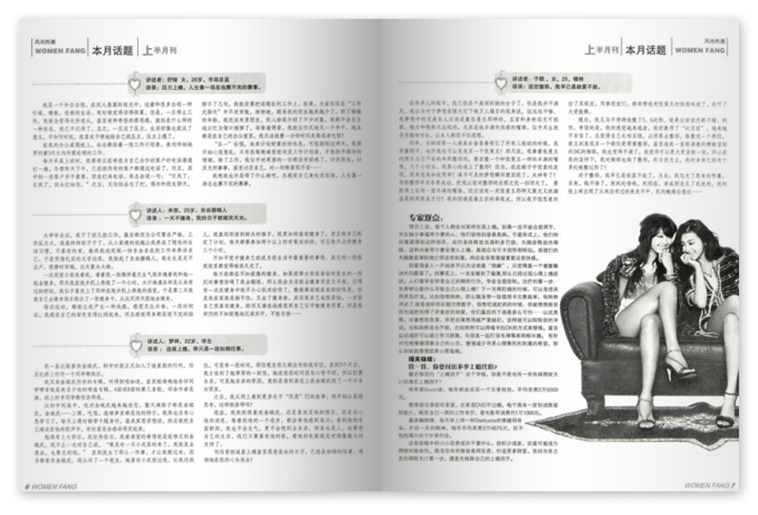 《女人坊》雜志多年來貴在不斷適應市場,并多次調整版塊、欄目、風格、版式、印刷,一步一個腳印,一年一個臺階,從只在國內發(fā)行到走向國際書刊市場。