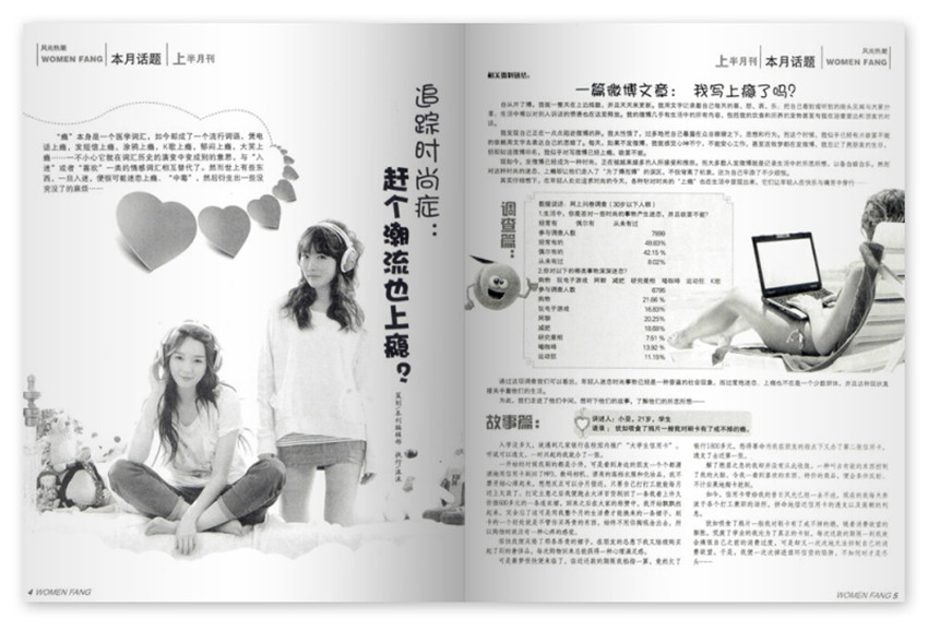 一本貼心的全新兩性期刊,在廣大讀者心目中有著不可替代的位置,時尚、新潮、精美、典雅,鮮明的個性和不俗的親和力,使一批又一批讀者成為自己的朋友,真的應了原來刊物扉頁的一句話;"你我一次偶然,將會成為永遠"。是女性朋友值得信奈的好朋友,定位為18-40歲的女性讀者,倡導自尊、自愛、自信、自立、自強的新時代女性精神,深受廣大讀者的推崇和喜愛。
