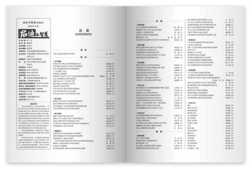 《啟迪與智慧》主要欄目:本刊視野、心理健康、能力培養(yǎng)、課題研究、閱讀與寫(xiě)作、外語(yǔ)教學(xué)、數(shù)理化園地、政史地、教育藝術(shù)、教學(xué)智慧、學(xué)習(xí)策略、課堂感悟、管理技巧。
