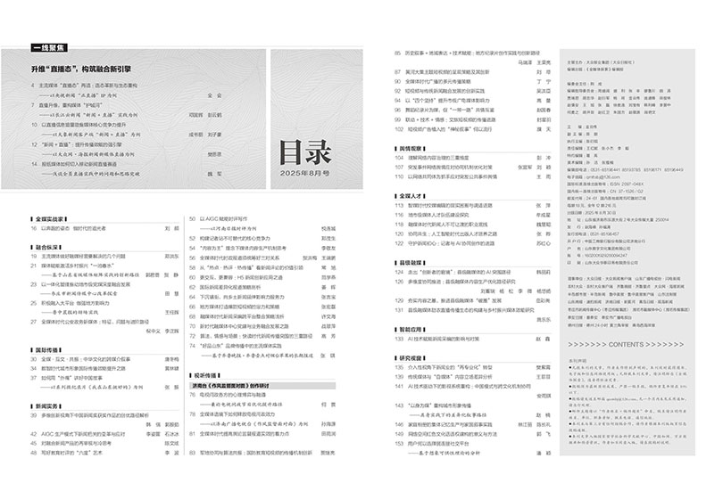 雜志通過整合學(xué)界與業(yè)界的優(yōu)質(zhì)資源,搭建了一個(gè)開放、互動(dòng)的交流平臺(tái),幫助從業(yè)者及時(shí)了解行業(yè)動(dòng)態(tài),掌握前沿技術(shù),提升專業(yè)素養(yǎng)。無論是傳統(tǒng)媒體的轉(zhuǎn)型探索,還是新興媒體的創(chuàng)新實(shí)踐,都能在該刊中找到有價(jià)值的參考。雜志以“融合”為關(guān)鍵詞,關(guān)注媒體如何借助新技術(shù)實(shí)現(xiàn)內(nèi)容生產(chǎn)、傳播方式和商業(yè)模式的升級,為行業(yè)提供可借鑒的案例和解決方案。