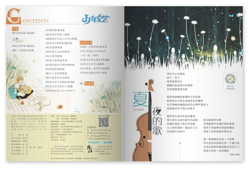 《少年文藝》(月刊)創(chuàng)刊于1976年,多年來雜志內(nèi)容及形式方面與時(shí)俱進(jìn),并以其形式和內(nèi)容的豐富性及多樣性,贏得了不同階層讀者的喜愛與擁護(hù)。為少年提供精彩有益、感同身受的閱讀體驗(yàn),也為他們提供不拘一格抒寫真情實(shí)感的空間,是一份在青少年及家長(zhǎng)老師當(dāng)中擁有良好口碑的品牌刊物。