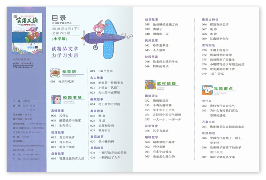 《實(shí)用文摘》真情故事、益智故事、名人故事、哲理故事、成長(zhǎng)故事、幽默故事、童話故事、偵探故事、勵(lì)志故事、科幻故事、校園熱讀;趣味語文、課延知識(shí)、開心成語、讀寫園地;為什么、萬事由來、冷熱知識(shí)、文明禮儀、煉意志、健體格好心情等。