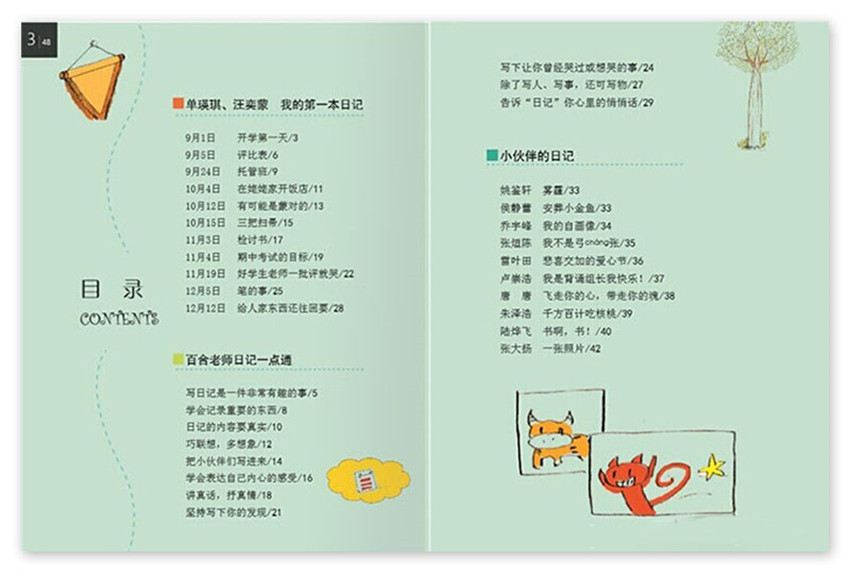 《我的第一本日記》主要欄目:開學(xué)第一天、開學(xué)典禮、評(píng)比表、沒事的包、托管班、找朋友等。