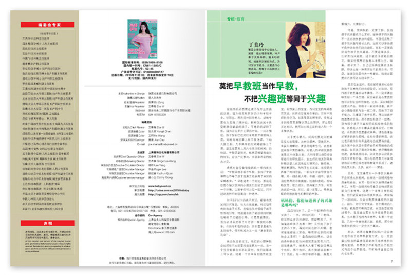 雜志引導(dǎo)時(shí)尚消費(fèi),探尋物質(zhì)生活的文化發(fā)現(xiàn),提供專業(yè)的孕育指導(dǎo),為準(zhǔn)備孩子新生用品父母提供購(gòu)物指南,成為孕產(chǎn)婦必不可少的實(shí)用工具雜志,善于分享初為人母的喜悅,和讀者的心靈產(chǎn)生強(qiáng)烈共鳴。
