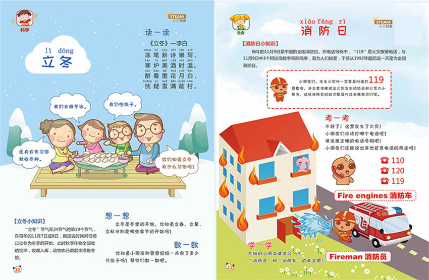 每月根據(jù)當(dāng)月的節(jié)日、季節(jié)、時(shí)令等,設(shè)置不同的學(xué)習(xí)主題。本月刊在感恩節(jié)、消防日、立冬等情境中融入了拼音、英語、填色、數(shù)學(xué)游戲、童謠、安全知識、詩歌、科普、繪本等知識的學(xué)習(xí)。