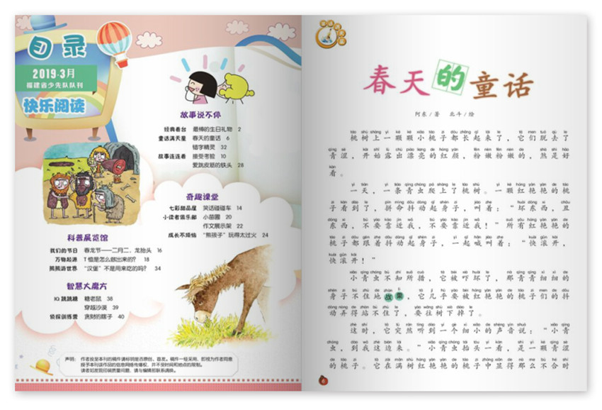 《小火炬》選自國外優(yōu)秀成長故事,名家翻譯,全球視野,讓小讀者了解異國的同齡人,展現(xiàn)學生習作,搭配老師點評,為各校老師指導的優(yōu)秀習作提供發(fā)表的平臺,結(jié)合本刊引進巴西原版漫畫《莫尼卡和伙伴們》,精心設(shè)計的趣味英語學習欄目,單詞、語法、短語及英語文化故事,讓小讀者快樂學英語。