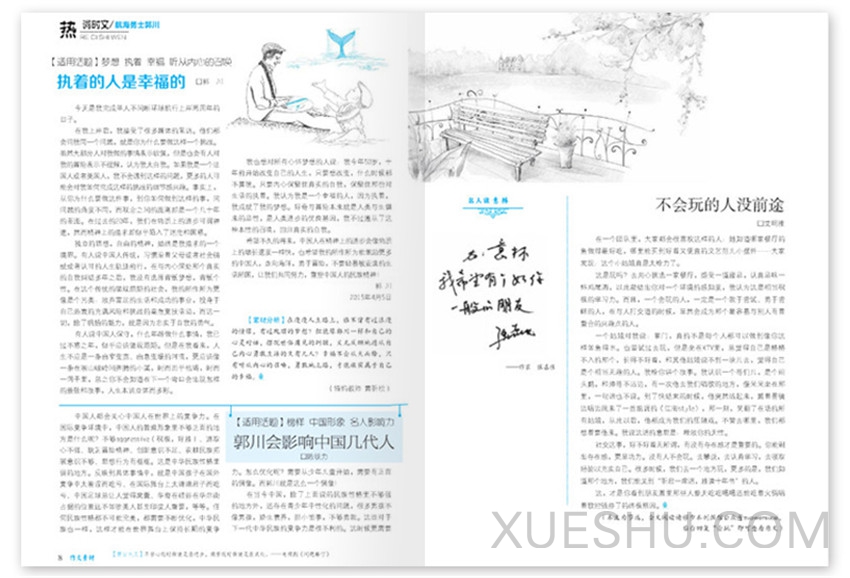 《意林·作文素材》(半月刊)創(chuàng)刊于2010年,多年來(lái)雜志內(nèi)容及形式方面與時(shí)俱進(jìn),并以其形式和內(nèi)容的豐富性及多樣性,贏得了不同階層讀者的喜愛(ài)與擁護(hù)。中高考命中率高!直接提分改變命運(yùn)!連續(xù)多年命中中高考作文、閱讀理解!