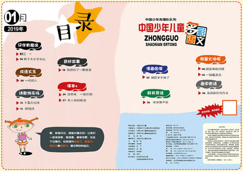 《中國少年兒童》主要欄目:漢字有魔法、成語大王、詩歌游樂場、奇妙故事、漫畫國學、好書導讀、我是大偵探、畫中有話等。