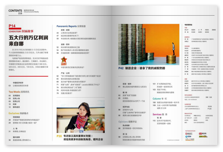 《中國(guó)經(jīng)濟(jì)周刊》主要欄目:中國(guó)經(jīng)濟(jì)時(shí)評(píng)、封面文章、特別報(bào)道、中國(guó)經(jīng)濟(jì)論壇、洞見、區(qū)域、產(chǎn)業(yè)、金臺(tái)銀街。